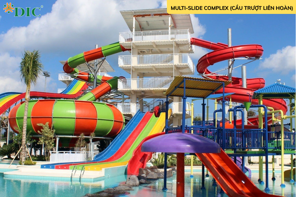 Cầu trượt liên hoàn (Multi-Slide Complex): nhiều máng trượt công viên khác nhau (như cầu trượt xoắn ốc, ống kín, trượt thẳng,…) cùng xuất phát từ một tháp – giúp đa dạng trải nghiệm, giảm ùn tắc và tăng công suất phục vụ.