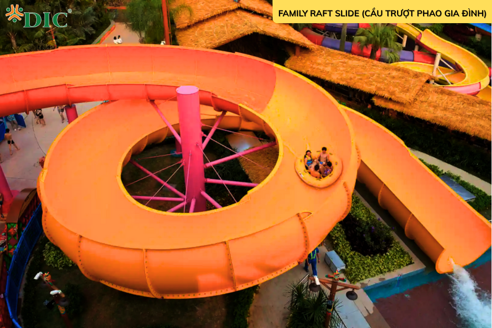 Cầu trượt phao/gia đình (Raft Slide / Family Slide): Người chơi ngồi trên phao trượt theo đường cong mềm, tạo cảm giác êm, vui nhộn, thích hợp cho nhóm 2–4 người và gia đình có trẻ nhỏ.