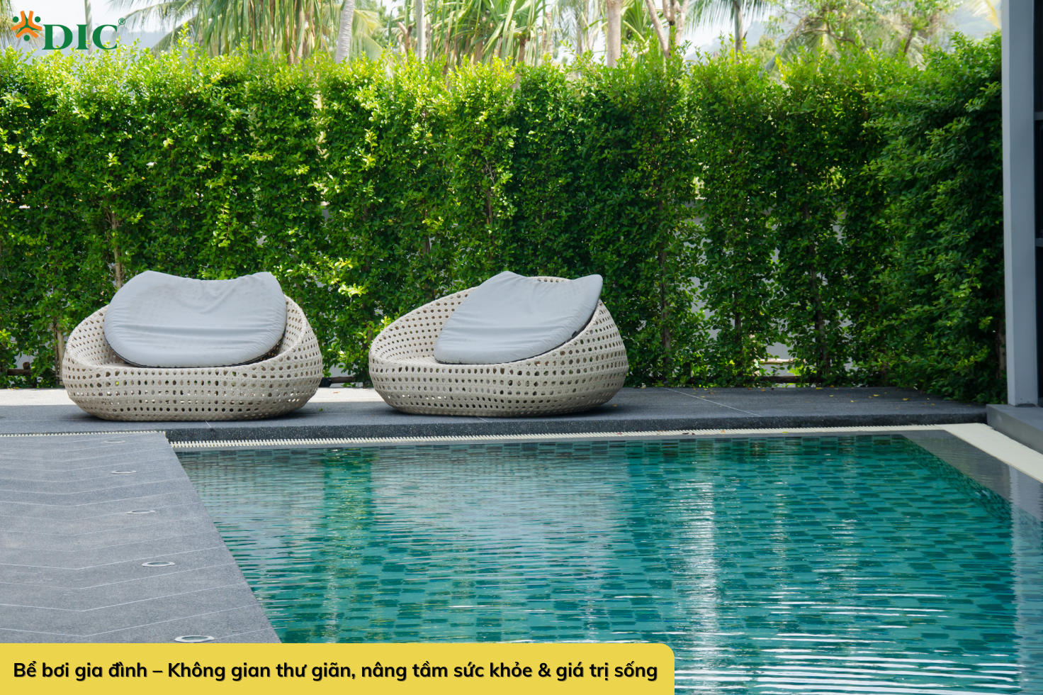 Một hồ bơi gia đình đẹp được thiết kế chuyên nghiệp với các mẫu bể bơi hiện đại (như bể bơi hình chữ nhật) sẽ làm tăng đáng kể giá trị thẩm mỹ và giá trị bất động sản, đặc biệt là với hồ bơi biệt thự.