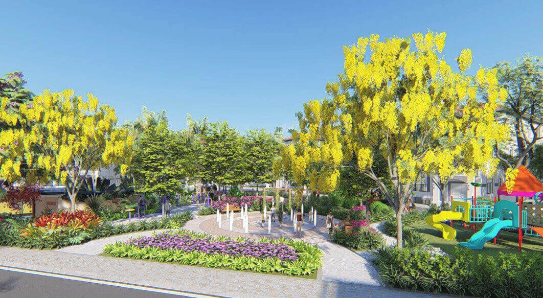 Tại đây, cư dân thoải mái tản bộ dưới những tán lá xanh, hệ thống nhà chờ nghỉ ngơi đặt quanh công viên. Những trò chơi vận động giải trí nhẹ nhàng cùng với hệ thống sân chơi nước dành cho các bé khiến bố mẹ hoàn toàn yên tâm cho con vui đùa. Bên cạnh đó, đài phun nước dạng vòm tăng tính thẩm mỹ cho khung cảnh cũng như tạo sự thích thú cho mọi người tản bộ quanh công viên.