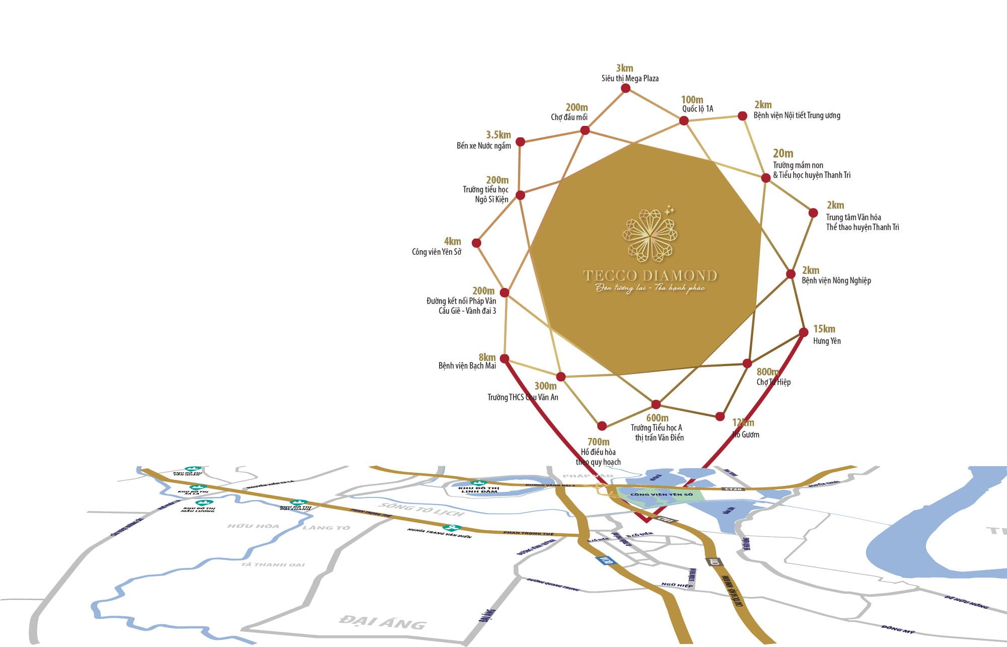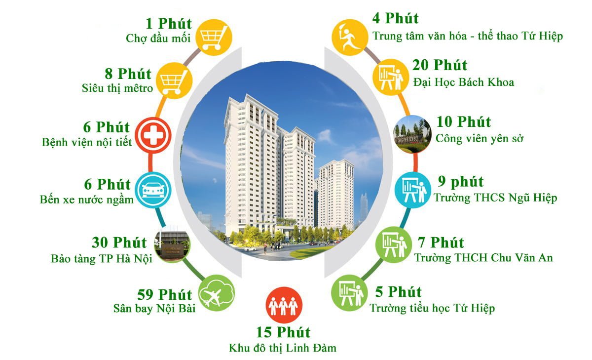 Nhờ vị trí trung tâm và giao thông thuận lợi liên kết các tiện ích xung quanh trong bán kính 0 – 2km: Siêu thị, trường học, bệnh viện, bến xe, chợ, dịch vụ,.. Với không gian thoáng đãng, mát mẻ và view đẹp do nằm cạnh Công viên Yên Sở được mệnh danh là ”lá phổi xanh lớn nhất của thủ đô”.