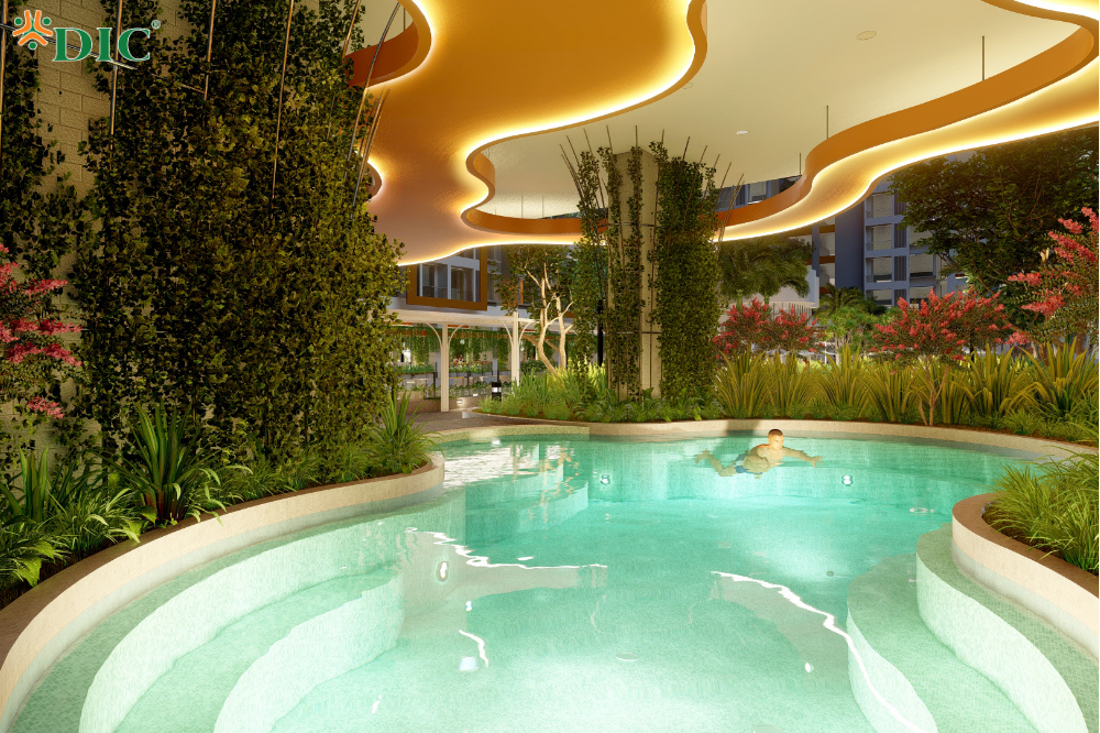 Trong hệ thống tiện ích ấy, DICTECH đã đảm nhiệm toàn bộ thiết kế thi công bể bơi. Không gian này vừa phục vụ nhu cầu thư giãn, vừa góp phần hoàn thiện cảnh quan chung.