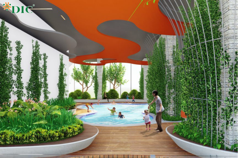 Khu vực hồ trẻ em nằm trong khối tiện ích nội khu có mái che, được bao quanh bởi mảng xanh và các vách cây leo tạo cảm giác gần gũi thiên nhiên. Bể được thiết kế dạng cong mềm mại, độ sâu an toàn, nền gạch chống trơn và hệ thống chiếu sáng dịu nhẹ.