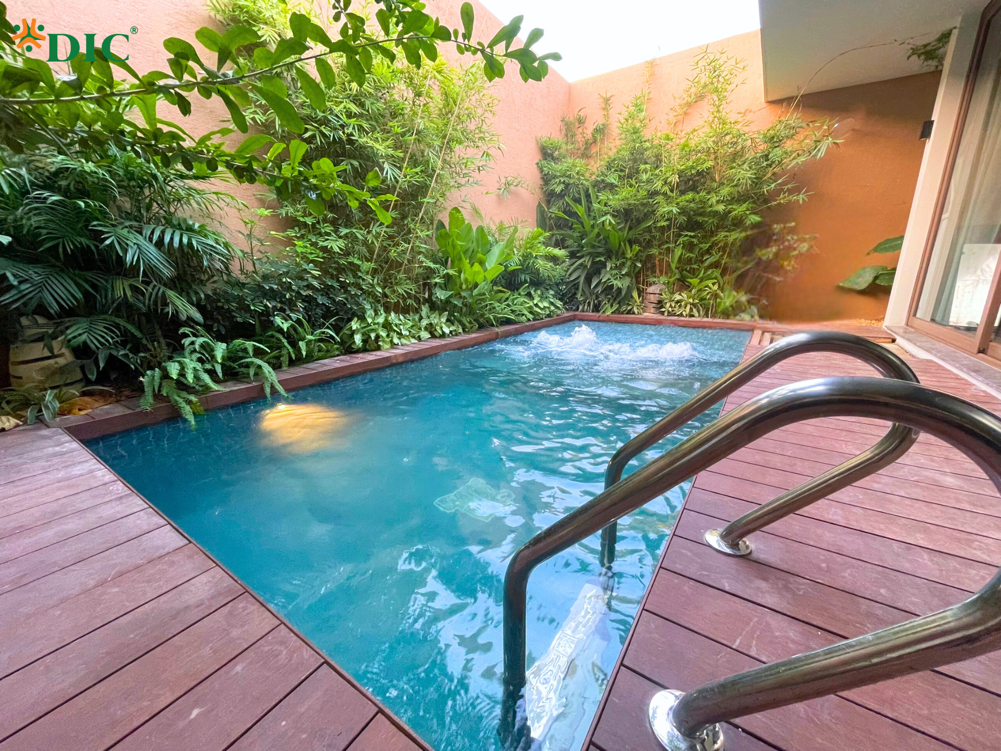 DICTECH thiết kế & thi công bể bơi sân vườn cho biệt thự tại khu Hoa Phượng, Vinhomes Riverside – Long Biên. Thiết kế chữ nhật tối giản, ốp mosaic xanh nổi bật giữa khu vườn ven kênh; hai dãy ghế ngồi thư giãn tích hợp đầu sục giúp “spa tại gia”; lan can kính giữ trọn tầm nhìn mà vẫn an toàn. Hệ thống lọc tuần hoàn, đèn LED âm nước và chi tiết bo mềm được tối ưu để vận hành êm, dễ bảo trì, phù hợp nhu cầu vừa bơi luyện tập vừa thư giãn của gia đình.