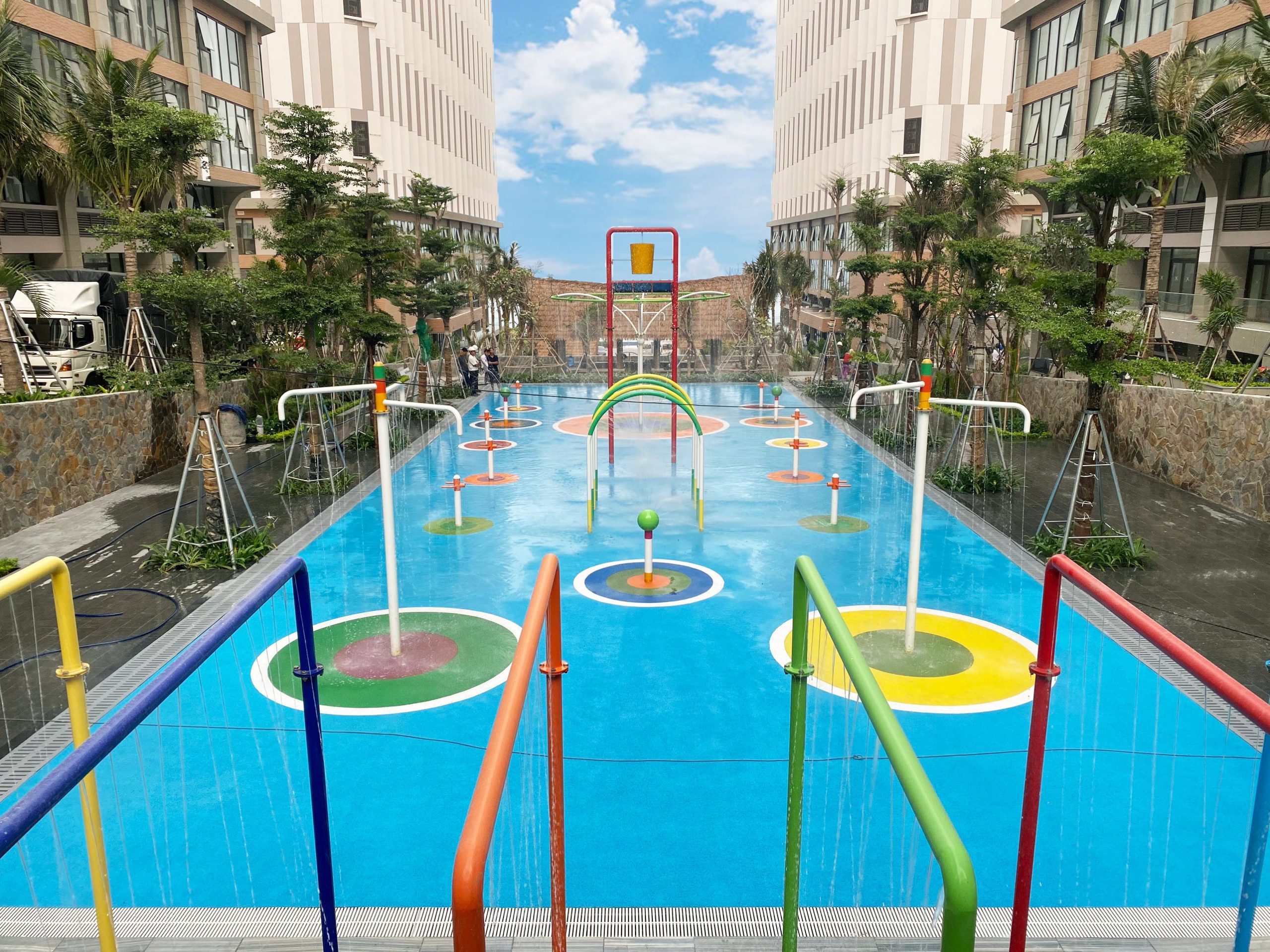 5. Sân chơi nước trẻ em (splash pad): trò chơi xô đổ nước, súng bắn nước, cầu vồng phun; thảm cao su chống trượt, đường ống đi ngầm, nước thu hồi–lọc tuần hoàn.