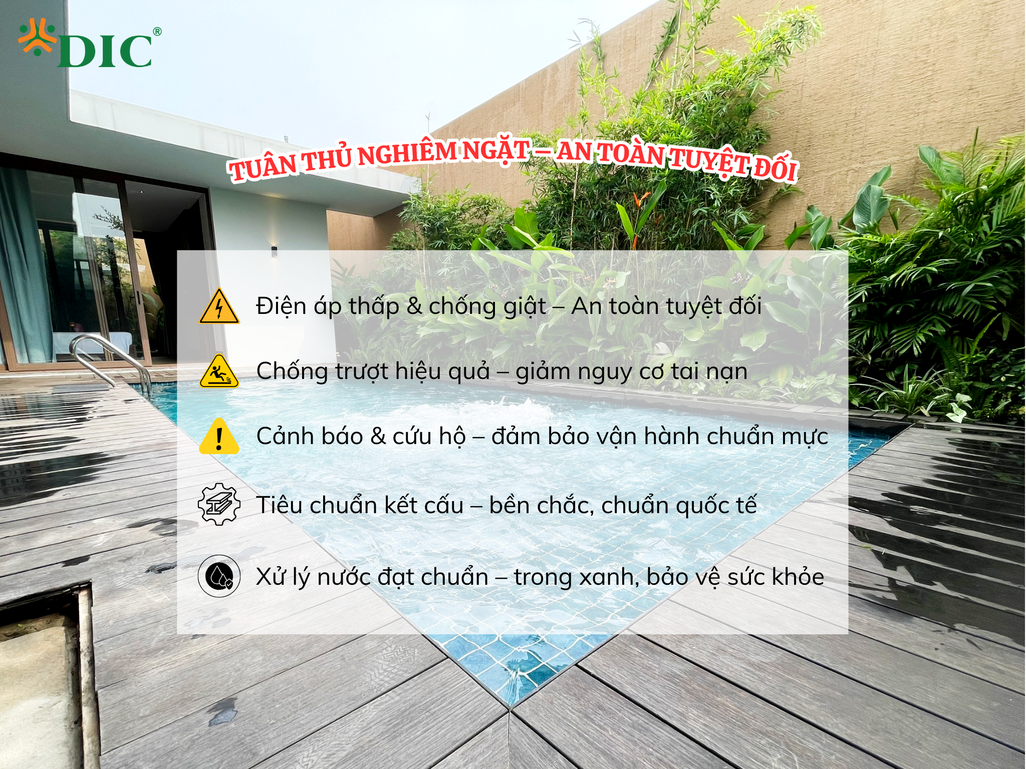 An toàn là ưu tiên không thể thỏa hiệp trong mọi dự án của DICTECH. Chúng tôi tuân thủ nghiêm ngặt các tiêu chuẩn kỹ thuật và quy định pháp lý để bể bơi an toàn tuyệt đối cho người sử dụng và môi trường.