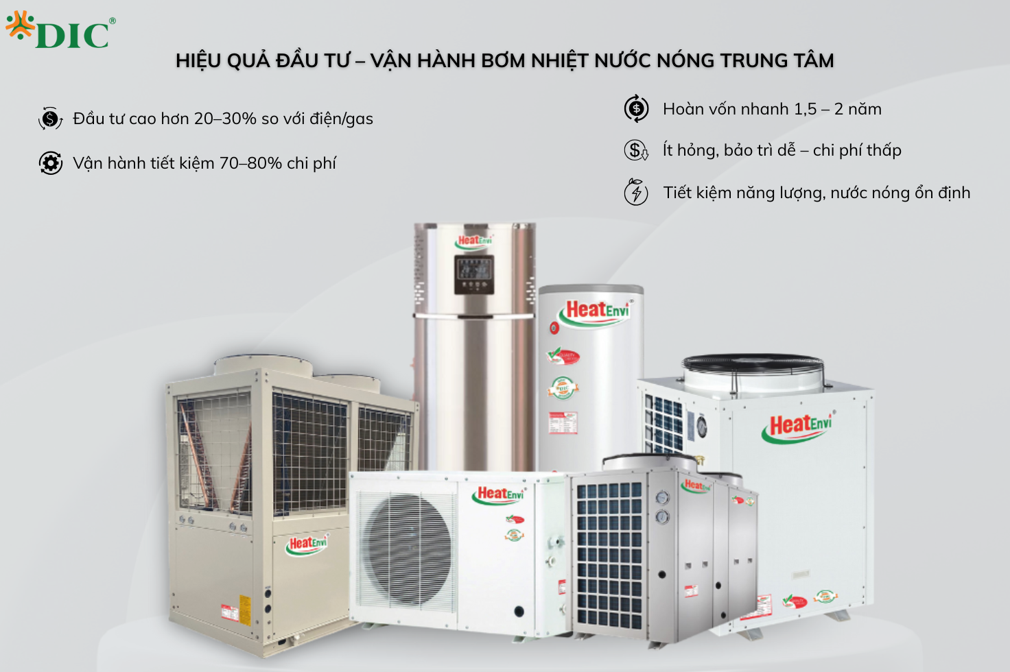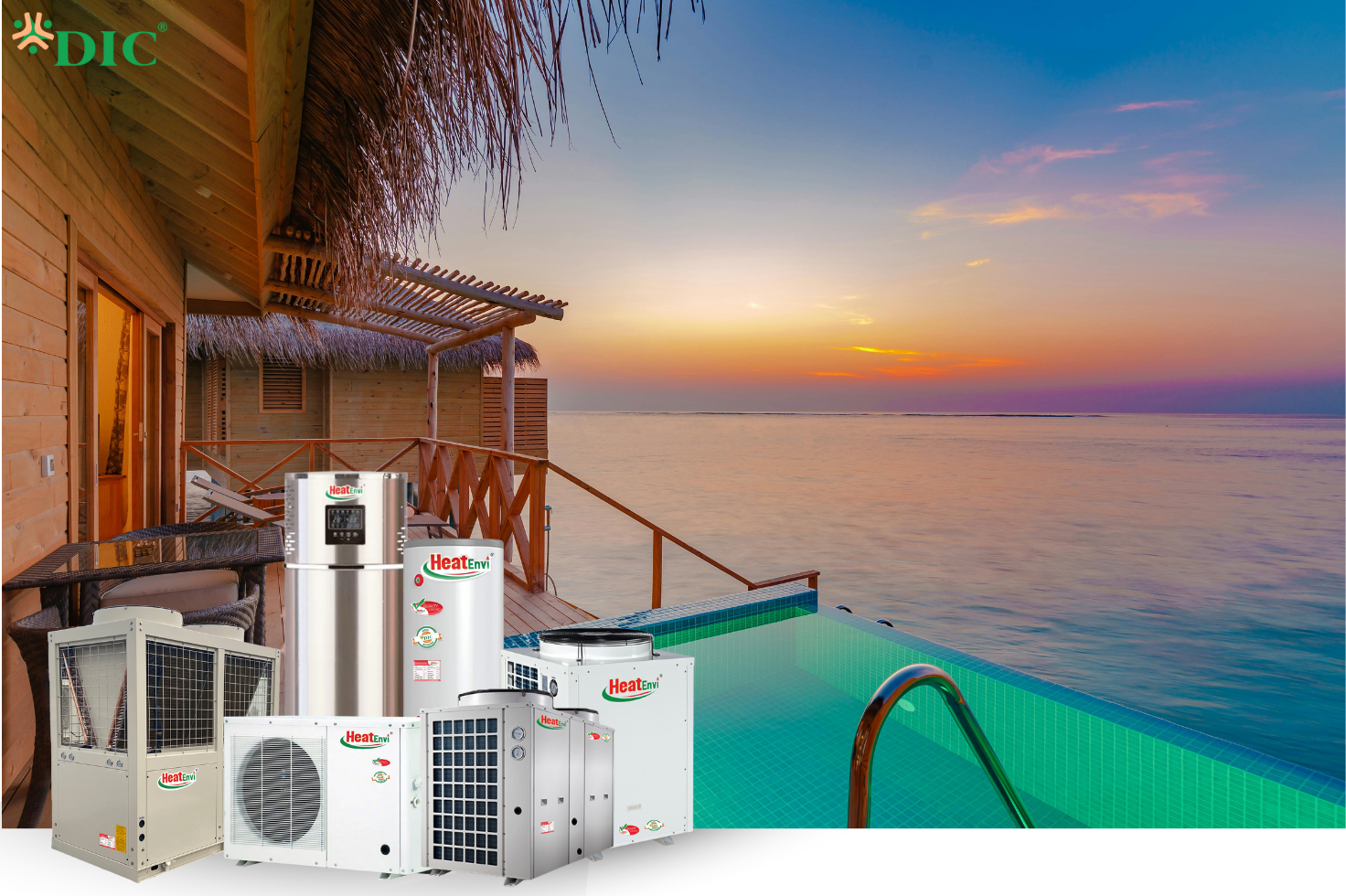 DICTECH cung cấp các dòng bơm nhiệt nước nóng trung tâm thương hiệu HeatEnvi, phù hợp cho nhiều loại công trình như nhà ở, villa, khách sạn và resort. Thiết bị được thiết kế để vận hành ổn định kể cả vùng ven biển, mang lại hiệu suất cao và độ bền lâu dài.